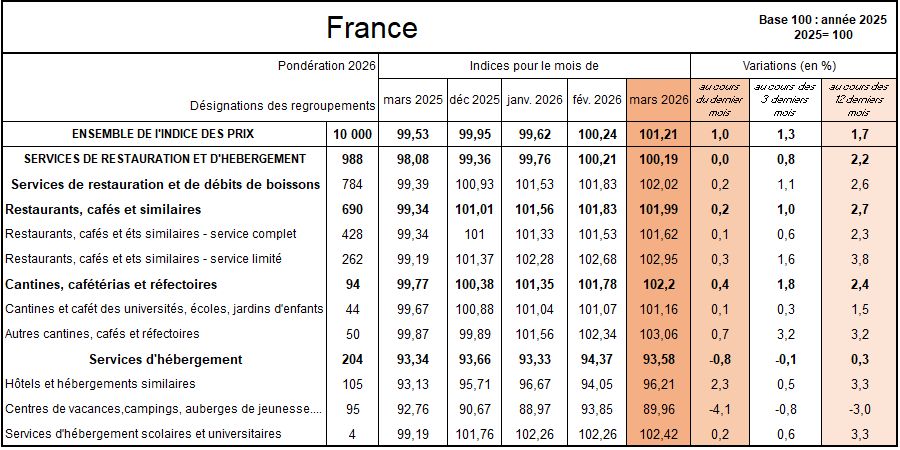 Indice des prix Insee Services de restauration et d’hébergement – mars 2026