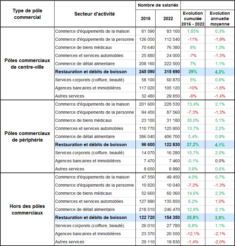 Dans une étude inédite, l'Insee s'est penché sur l'emploi salarié dans les 6 700 pôles commerciaux français de centre-ville et de périphérie où se concentrent les deux tiers des points de vente aux ménages. Entre 2016 et 2022, c'est dans la Restauration et les Débits que l'emploi a le plus fortement progressé (+4,2 % par an en moyenne). Dans les pôles de centre-ville, où se concentrent près de la moitié des pôles commerciaux, ces deux secteurs emploient trois salariés sur dix, et constituent les premiers employeurs de ces pôles, assez loin devant les Commerces alimentaires.