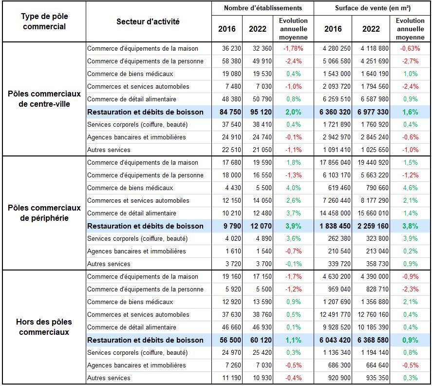 Lecture : en 2022, dans les pôles commerciaux de centre-villes, la Restauration et les Débits de boissons disposent de 95 120 établissements, soit 12 % de plus qu’en 2016.