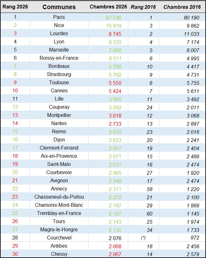 Ce décalage avec la taille des villes est encore plus manifeste s’agissant des volumes de chambres. La capacité en lits des deuxième et troisième villes de France (Lyon et Marseille) est nettement inférieur à celle de la ville (Nice) ou , encore, celle de la petite commune de Lourdes. Ceci en raison de leur fréquentation touristique respective. Seule Paris fait exception, avec ses 37,3 millions de touristes accueillis en 2025 (dans le Grand Paris).
