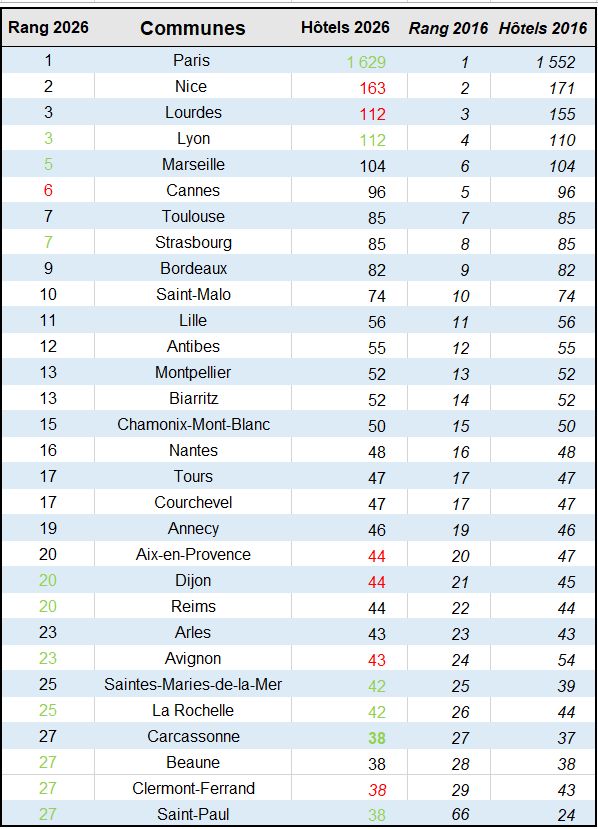 Ce Top 30 reflète bien d’avantage le niveau de fréquentation touristique d’une commune que sa population endogène. Mais avec des écarts parfois là-aussi. Lyon, qui serait à la deuxième place en terme de nuitées et de fréquentation, arrive à la troisième pour le nombre d’hôtels.