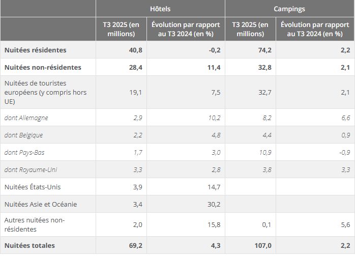 Au cours du troisième trimestre 2025, la fréquentation dans les hôtels atteignait 69,2 millions de nuitées. Ceux-ci enregistrent 2,8 millions de nuitées de plus qu’au troisième trimestre 2024. Ils ont tiré d’un boom de la clientèle non résidente (+11,4 %, soit près de 3 millions de nuitées supplémentaires). Alors que celle-ci avait baissé sur la même période de 2024 (-3,8 %).