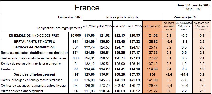En octobre, l'indice Insee des prix des services de Restauration et d'Hébergement s'est maintenu, comme en septembre, à +2,2 % sur 12 mois, après s'être fixé à +2,4 % en juillet et août, sans revenir encore à son plancher historique de +1,9 % atteint en avril 2025. Cette constance apparente masque un léger fléchissement de l'inflation dans les services d'Hébergement (+3,2 % après +3,4 %), due en premier lieu à la dernière baisse saisonnière enregistrée dans les campings, résidences de tourisme et villages vacances (-5,5 % sur 1 mois, +2,4 % en rythme annuel).