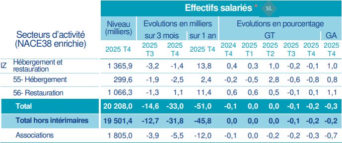 Mais en 2025, les effectifs du secteur de l’Hébergement-Restauration ont reculé sur deux trimestres consécutifs, le troisième (-0,2 %, en glissement trimestriel) et le quatrième (-0,1 %, idem)