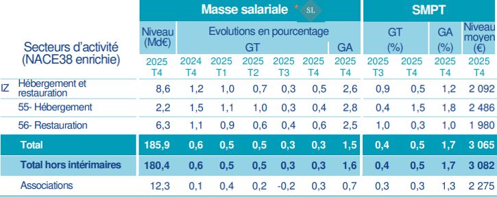 La masse salariale du secteur, progresse de 0,5 % au 4ème trimestre 2025 et de 2,6 % sur un an. Elle augmente dans l’Hébergement plus faiblement sur 1 T et plus fortement sur 12 mois : +0,3 % sur le 4T 2025 et +4 % sur un an, à 2,242 milliards d’euros. A l’inverse de la Restauration ( (+0,6 % sur le 4T 2025 et +2,5% sur un an, à 6,334 milliards d’euros).