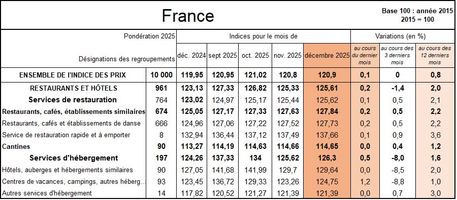 L'indice Insee des prix des services de Restauration et d'Hébergement remonte légèrement en décembre, avec une progression annuelle de +2 % après +1,9 % en novembre. Le maintien à + 2,1% des prix de la Restauration, n'a pas équilibré le doublement de l'inflation dans l'Hébergement de +0,8 % à + 1,6 %. En moyenne annuelle 2025, la tendance est inverse, grâce à la forte baisse de l'inflation dans la Restauration (ramenée à +2,1 % après +3,1 % en 2024). Celle-ci surcompense une hausse des prix de nouveau plus vive dans l'Hébergement (+3,7 % après +3,1 %).