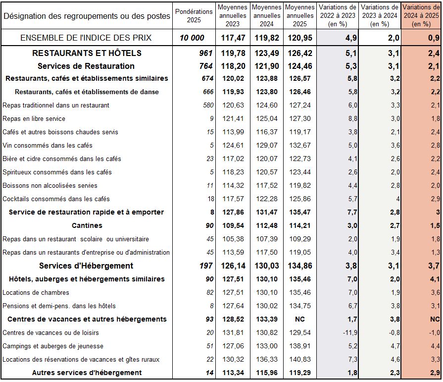 L’indice global des prix à la consommation a enregistré une forte décélération de l’inflation l’an dernier, à +0,9 %. Après +2% en 2024. +4,9 % en 2023. + 5,2 % en 2022. C’est aussi le cas des services de Restauration & d’Hébergement.