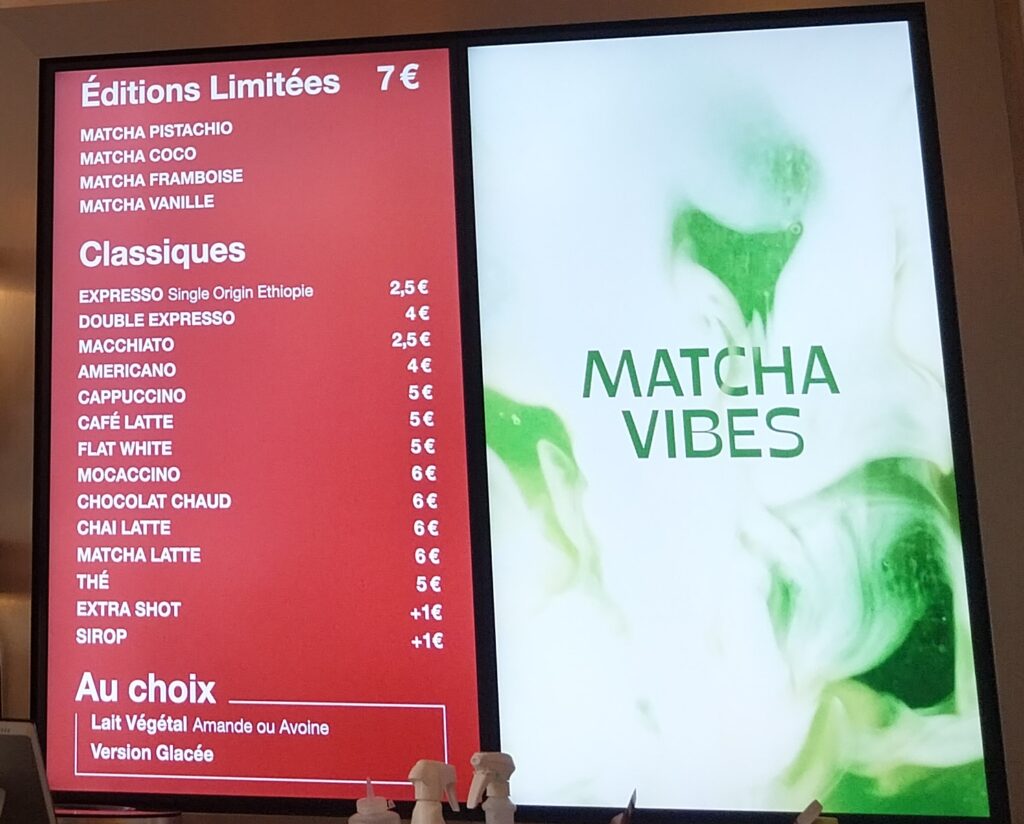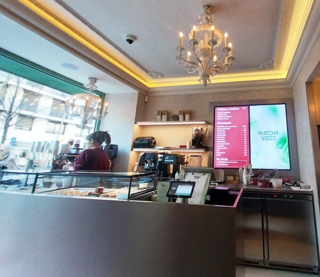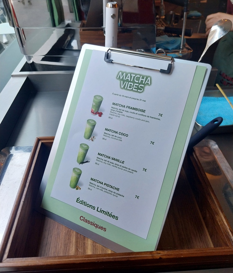 Le café sera évidemment central. Avec en tête un expresso d’origine Ethiopie. Et toute un gamme de boissons chaudes, Machiatto, Americano, Capuccino, Moccacino…. Et également le déjà connu chocolat chaud Ladurée. Mais aussi une carte de quatre matchas « éditions limitées ».