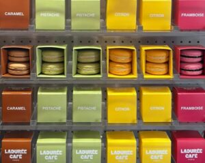 Quant aux desserts, le produit de base reste les macarons, ainsi que des viennoiseries cuites sur place et des financiers. Avec quelques recettes et un packaging conçus pour Ladurée version coffee shop. Comme ces biscuits « Tendresse ». Et ces box de deux macarons à emporter.
