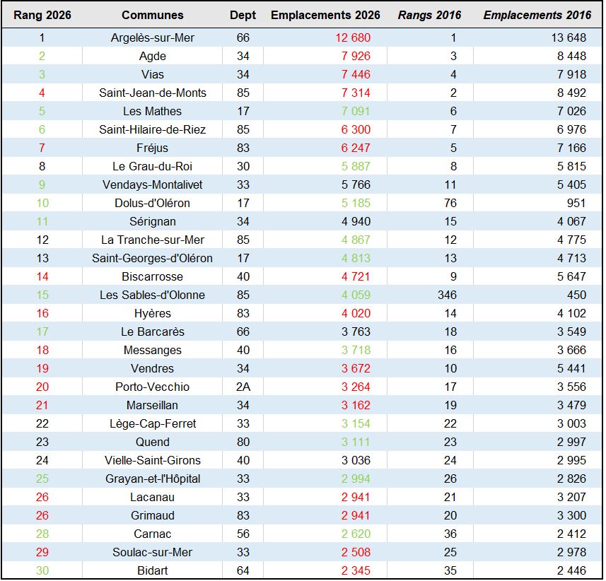 Ces trente communes ne regroupent que 532 campings, soit seulement 7 % du parc total français (proportion comparable en 2016). En 2016, le Top 30 en regroupait 92 de plus (624). Cette diminution reflète d’ailleurs celle du parc global. Près de 1 100 campings ont disparu en l’espace de dix ans. On en dénombrait 8 459. On en dénombre aujourd’hui 7 370.