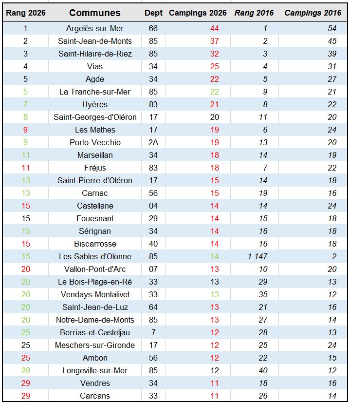 Ces trente communes ne regroupent que 532 campings, soit seulement 7 % du parc total français (proportion comparable en 2016). En 2016, le Top 30 en regroupait 92 de plus (624). Cette diminution reflète d’ailleurs celle du parc global. Près de 1 100 campings ont disparu en l’espace de dix ans. On en dénombrait 8 459. On en dénombre aujourd’hui 7 370.