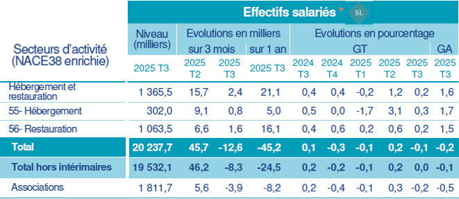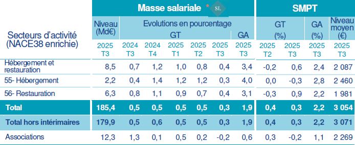 L'Hébergement Restauration est le secteur du privé qui a créé le plus d'emplois salariés au cours des 12 derniers mois. Avec 1,365 millions salariés, ses effectifs ont progressé de 0,2 % au troisième trimestre 2025 (2 380 postes en plus par rapport au 2T), et de 1,6 % sur un an, soit 21 000 salariés, dont plus des trois quarts dans la Restauration. La masse salariale de la branche (8,4 milliards d'euros, hors Prime Macron) est en hausse de 0,4 % ce trimestre et de 3,4 % sur un an. Tandis que le Salaire Moyen Par Tête n'augmente que de 2,4 %, à 2 087 euros. Données Urssaf.